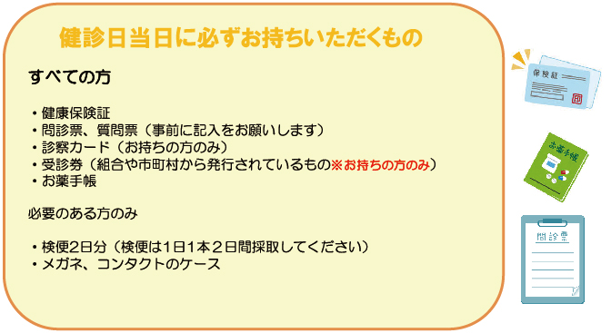 なお、当日の健康状態および検査結果によっては実施できない検査もありますのでご了承ください。