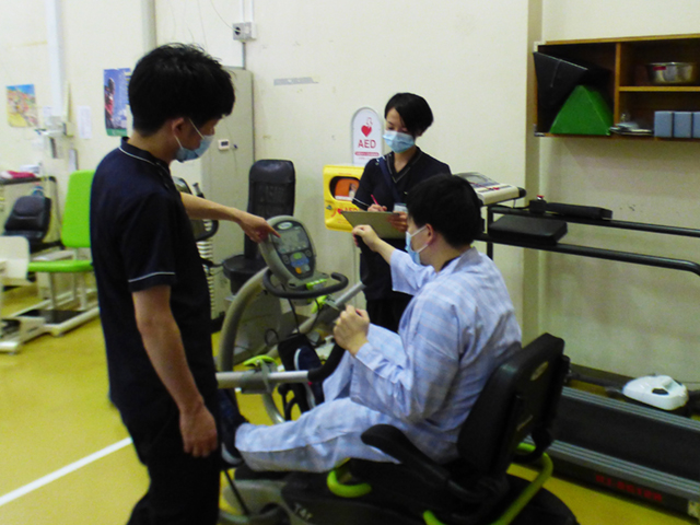具体的には、慢性閉塞性肺疾患(COPD)や間質性肺炎などの慢性呼吸不全や急性肺炎に対しての呼吸理学療法や、心不全など循環器疾患に対しての心臓リハビリテーションを行っています。また、地域連携パスにより大腿骨頸部骨折術後などの運動器疾患に対し早期より受け入れ、運動療法を行っています。
