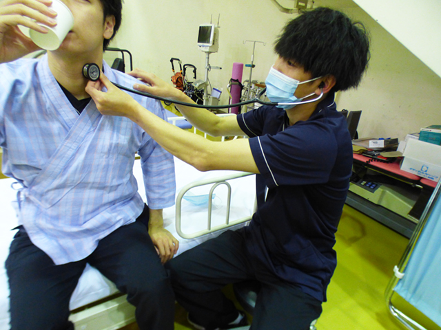 当院では上手く噛めない、または上手く飲み込むことができない嚥下(えんげ)障害の方に対してのリハビリを中心に行っております。嚥下障害は、脳梗塞によって顔や舌に麻痺が出現し引き起こされること、加齢によって喉の筋肉が衰えること等さまざまな原因があります。また、嚥下障害の方は、誤嚥(食べ物や唾液が食道ではなく、気管に入ってしまうこと)しやすく、咳で誤嚥した食べ物を出すことができないと誤嚥性肺炎を引き起こす可能性があるため、早期にリハビリを開始できるよう努めております。