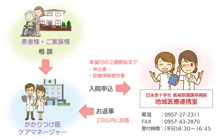 - ご利用希望日の少なくとも2週間前までに、医療連携室へお申込み下さい。 (急を要する場合等、随時相談に応じます。)