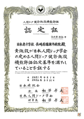 当院健診部は、令和3年4月1日「日本人間ドック学会 人間ドック健診施設機能評価Ver4.0」の認定を受けました。